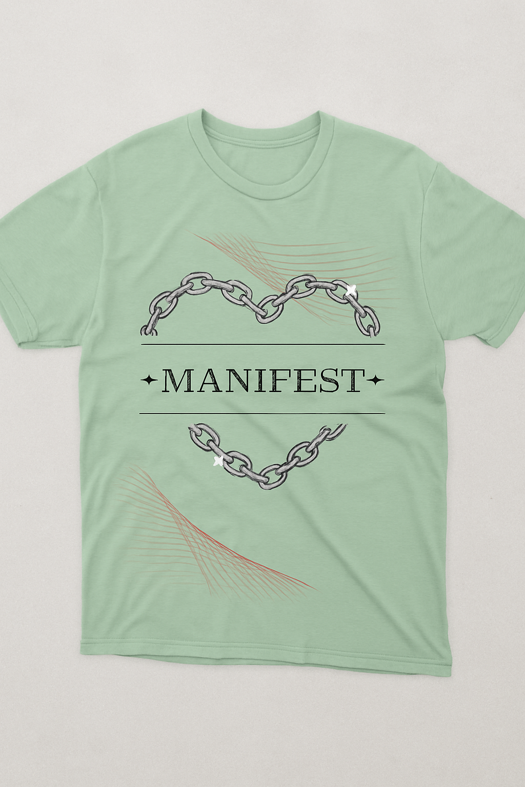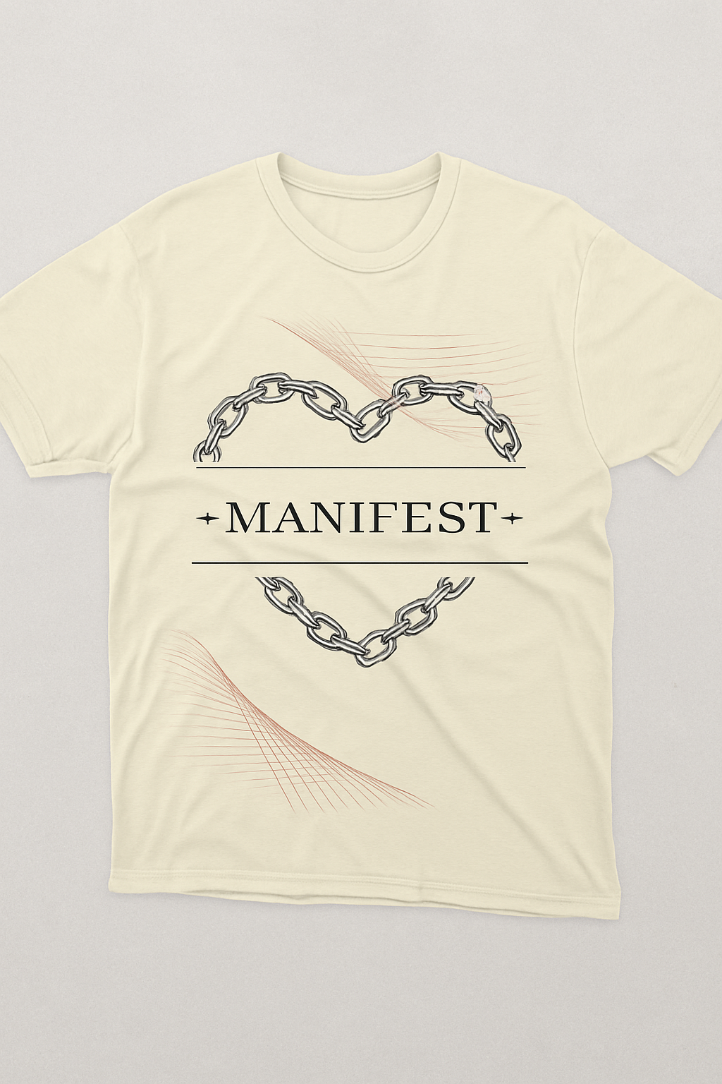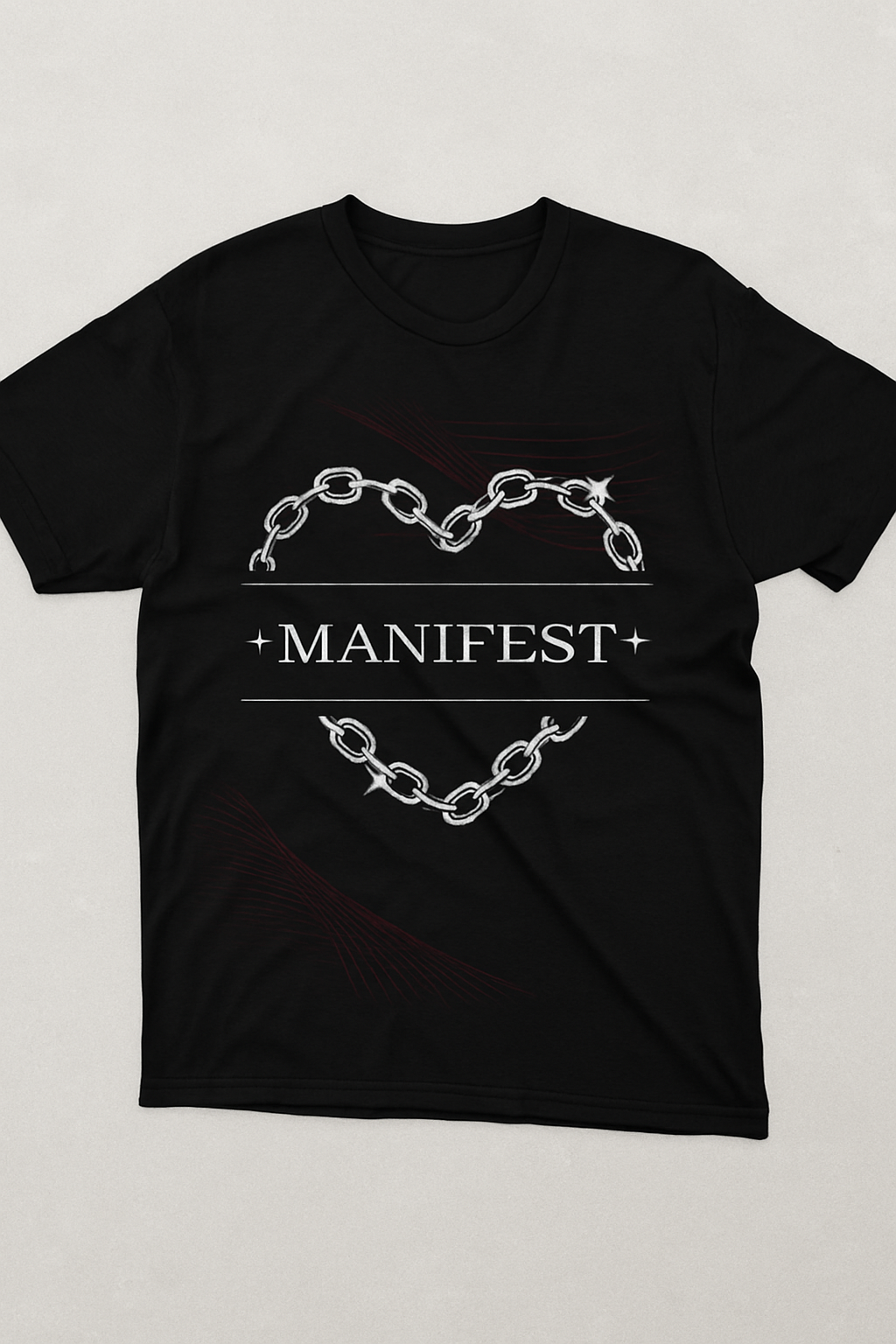 Turn your mindset into your message with the bold “MANIFEST” graphic tee. Featuring a striking heart-shaped chain design and metallic accents, this black T-shirt is made for those who believe in building their own destiny.
